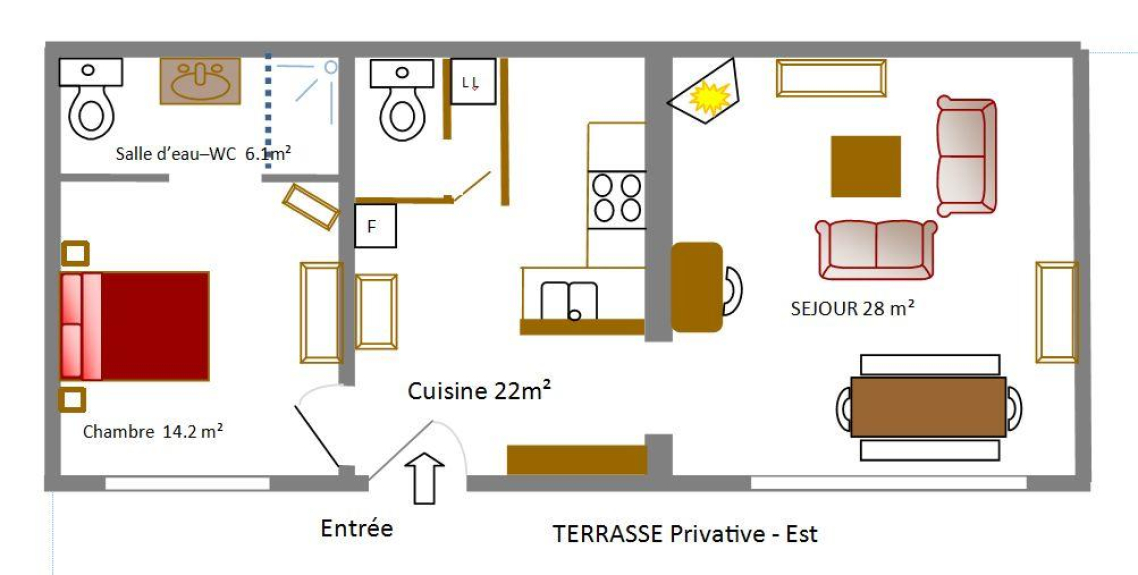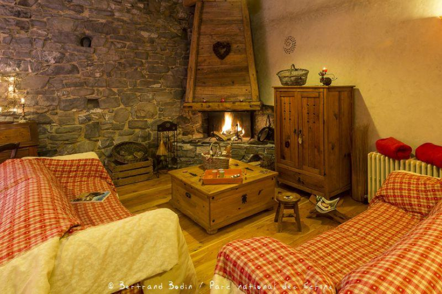 De woon-eetkamer is uitgerust met een bureau (toegang tot internet), een open haard (hout geleverd), een bibliotheek met romans, boeken, diverse tijdschriften (Montagne Magazine, National Géographic, Vertical, Alpes Magazine, Parapente Mag, enz.), 2 banken, televisie, dvd-speler (met keuze uit dvd's), mini-hifi-installatie, talrijke gezelschapsspelen.