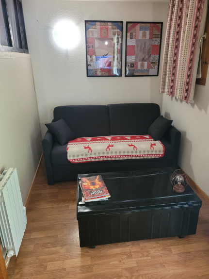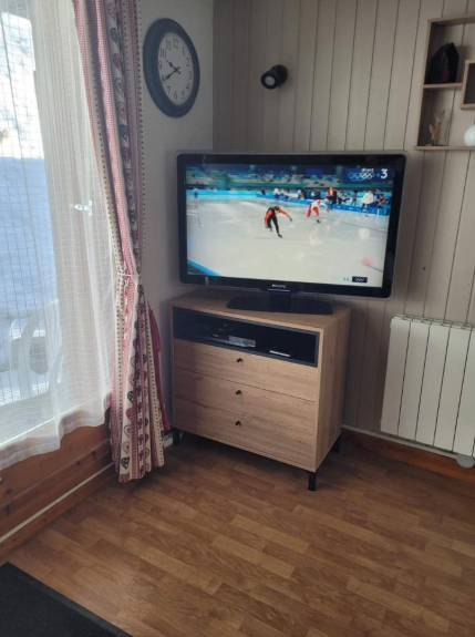 * een woonkamer uitgerust met een slaapbank voor 2 personen (140cm), een opbergkolom, een opbergkoffer, een flatscreen televisie (110cm), een DVD/blue-ray speler, boeken, strips, spelletjes...