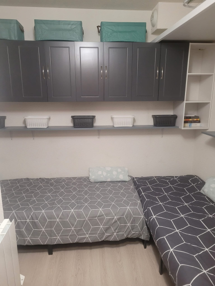 * een gesloten bergruimte voor 2 personen: met 2 stapelbedden van 80x190 cm, een grote kleerkast (3 kolommen opbergruimte + kleerkast)