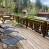 Buiten, een houten tafel en banken, ligstoelen, een gasbarbecue.