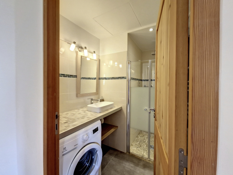 Een doucheruimte met wasmachine en 1 aparte WC