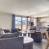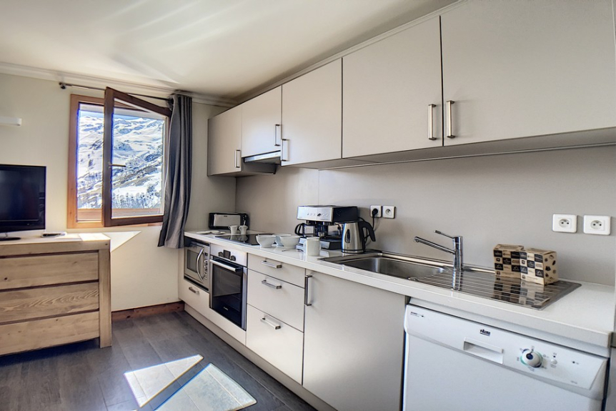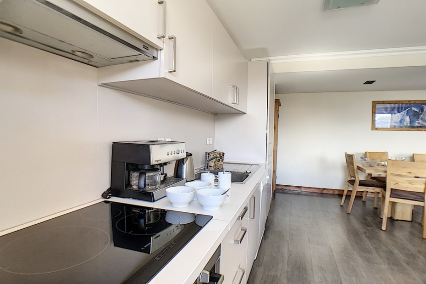 Open keuken uitgerust met 4 inductiekookplaten, koelkast, oven, magnetron, afwasmachine.