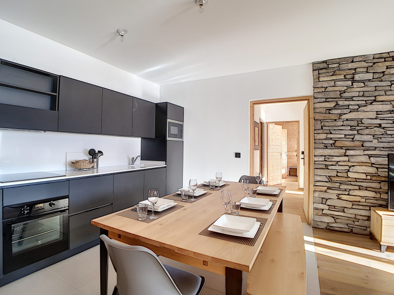 Dit grote chalet van steen en hout biedt 5 luxe appartementen die authenticiteit en moderniteit combineren. Het geniet van een bevoorrechte en gegeerde ligging, op de hoogten van de badplaats Les Menuires in de wijk Reberty 2000.