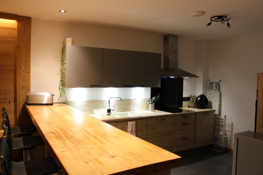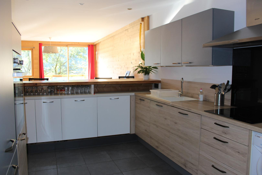 Grote volledig uitgeruste open keuken: vaatwasser, wasmachine, magnetron, oven, vriezer, koffiezetapparaat, waterkoker, broodrooster, raclette machine, fondue machine.