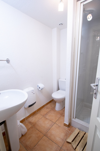 Badkamer: douche, wastafel en WC