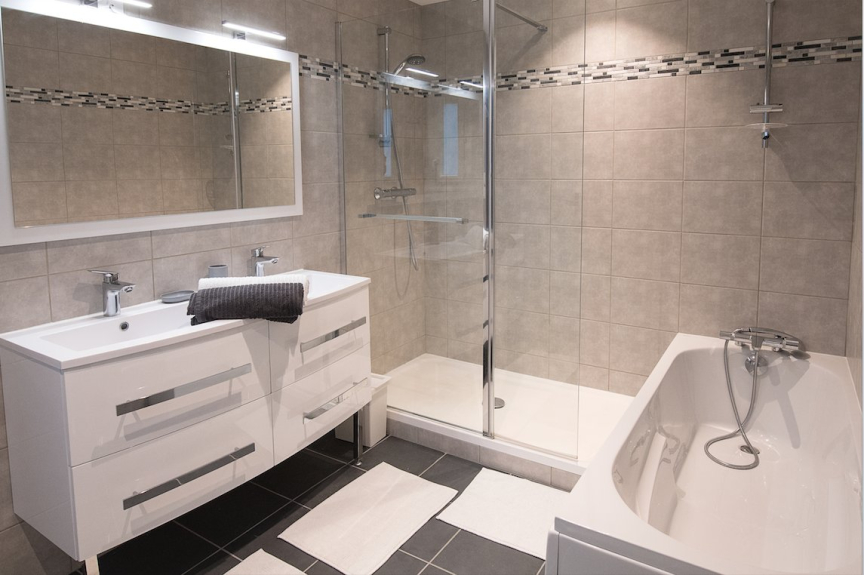 - 1ste verdieping: 2 slaapkamers of master suites uitkomend op een grote badkamer met douche en bad. 2 slaapkamers met elk een badkamer met douche. WC op de eerste verdieping.