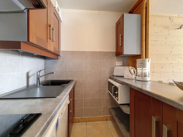 Aparte keuken met 2 keramische kookplaten, combimagnetron, koelkast en afwasmachine, broodrooster, waterkoker en koffiezetapparaat