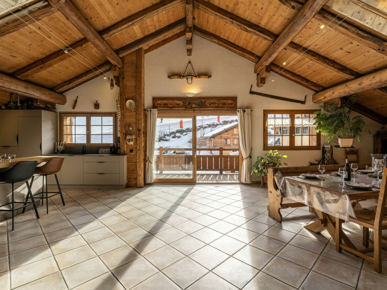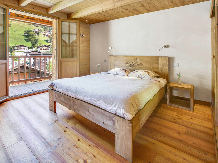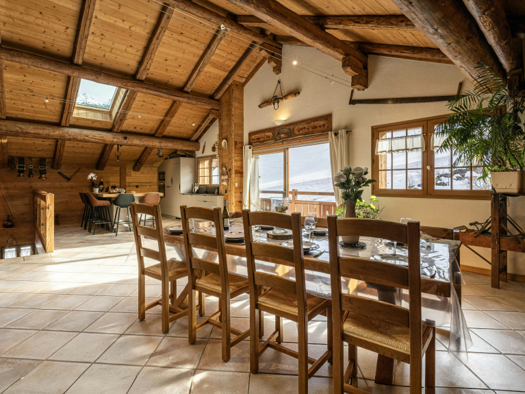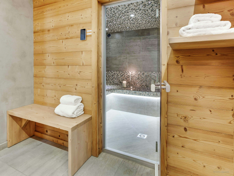 Het terras kijkt uit op de pistes in de winter en op de tuin in de zomer. Het is de ideale plek om van de ochtendzon te genieten of om op een heldere dag naar de sterren te kijken. In de winter kunt u na het verlaten van de pistes samenkomen rond het vuur op de stoep van uw chalet. Wat de hammam en de jacuzzi betreft, u zult er in elk seizoen van kunnen profiteren na een lange dag in de open lucht!