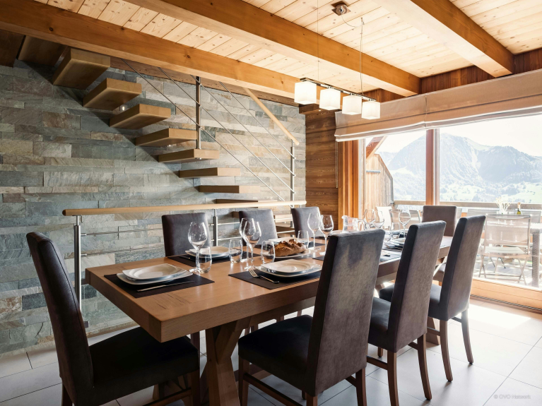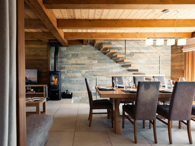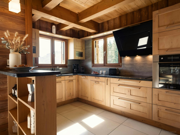 De prachtige eiken keuken is gemaakt door de plaatselijke timmerman en biedt een warme en functionele omgeving om te koken. Met de hulp van een binnenhuisarchitect hebben de eigenaars het hele chalet ingericht met een subtiel evenwicht tussen Savoyaards rustiek en hedendaags comfort. De houtkachel maakt de woonkamer gezellig en gemoedelijk, de ideale plek om aan het eind van de dag samen te komen en je voor te bereiden op de avonturen van de volgende dag.