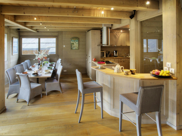 Chalet Fernuy is verdeeld over drie verdiepingen. De woonruimte op de begane grond is open en zeer licht met dubbel hoge plafonds, grote erkers en glazen deuren naar de patio. U kunt dineren op het terras, lezen of ontspannen in het Scandinavische bad. De gezellige woonkamer heeft een houtkachel, kussens en plaids. Deuren openen naar het balkon waar u kunt genieten van de zonsondergang en het uitzicht. De compacte keuken is volledig uitgerust, geopend door een bar. Tien mensen kunnen aan de tafel zitten. Er is een tweepersoons slaapkamer op deze verdieping, met een en-suite badkamer met douche en een apart toilet.