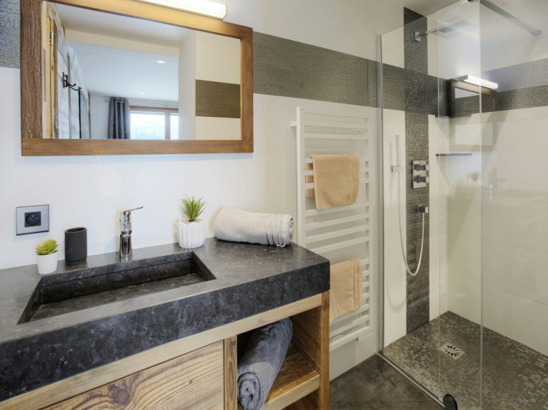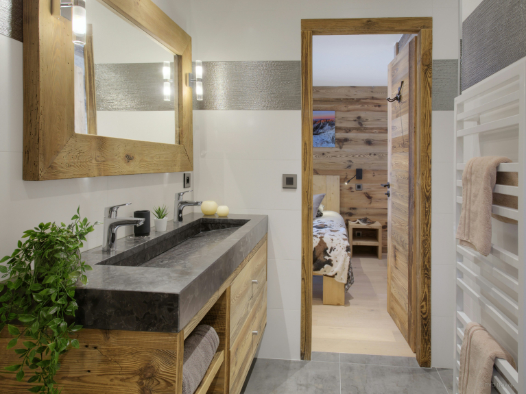 De leefruimte is verdeeld over drie niveaus. De ingang is op de eerste verdieping. U heeft toegang tot de grote dubbele garage, die zeer ruim is voor het stallen van fietsen en ski's, en tot de skiruimte met een verwarmd schoenenrek. Op het eerste niveau is er ook een grote woonkamer met eet- en keukengedeelte. Grote ramen en deuren geven toegang tot het grote, goed belichte balkon dat zich uitstrekt over één zijde en de puntgevel van het chalet. Er is genoeg te eten voor iedereen in de moderne, goed uitgeruste keuken. Er is een grote Amerikaanse koelkast om uw drankjes koud te houden en een bar voor het ontbijt, en de tafel is groot genoeg om samen een maaltijd te delen. En na het diner kunt u ontspannen op de comfortabele sofa's om een film te kijken of een slaapmutsje te drinken aan de bar.4 van de 5 kamers liggen op tuinniveau en hebben toegang tot een terras. Zowel in de zomer als in de winter kunt u 's morgens vroeg de deuren openen om de frisse berglucht binnen te laten; een geweldige manier om de dag te beginnen! Drie van de slaapkamers zijn tweepersoonskamers en de vierde is een kinderkamer, uitgerust met een stapelbed, een eenpersoonsbed en een en-suite badkamer met douche. De vijfde slaapkamer is een ruime suite op de bovenste verdieping. Naast de zeer grote en-suite badkamer heeft deze luxueuze ruimte ook een kleedkamer en een balkon met spectaculair uitzicht. De drie verdiepingen zijn met elkaar verbonden door een zeer elegante trap van hout en glas, waardoor het licht naar binnen stroomt.