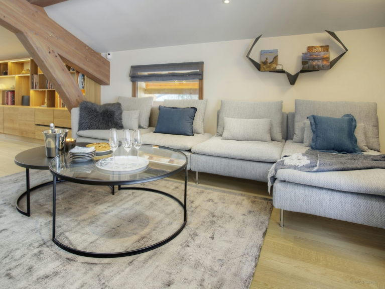 Ga dan naar boven naar het midden van het woongedeelte. Aan de ene kant is de volledig uitgeruste keuken met bar, grote tafel en planken. Aan de andere kant staan comfortabele sofa's, fauteuils en salontafels rond een centrale open haard en TV. U zult het heerlijk vinden om in deze kamer een film te kijken, over uw dag te vertellen of uw volgende bergavontuur te plannen. Een trap leidt naar het terras en de tuin, aan de achterkant van het chalet, waar u de zonsondergang kunt zien en misschien zelfs een barbecue kunt bereiden.
