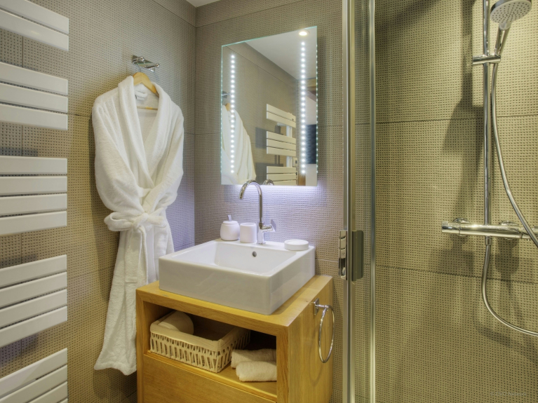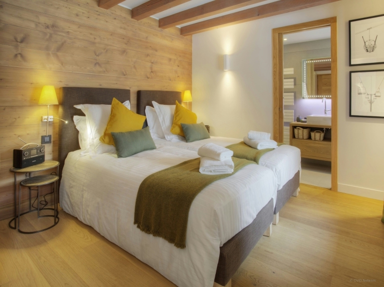 Ga naar de eerste verdieping, waar nog drie slaapkamers zijn. Een tweepersoonskamer met en-suite badkamer met douche en toegang tot het terras, en nog twee tweepersoonskamers met en-suite badkamer met douche, waarvan een kan worden opgemaakt als een twin indien u dat wenst. Beide slaapkamers hebben toegang tot het balkon, en één heeft toegang tot een terras aan de zijkant van het chalet. Alle kamers hebben een eigen TV, dus iedereen kan kijken naar welk programma hij maar wil.
