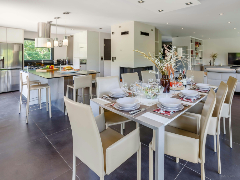 Het eetgedeelte kijkt uit op de patio en de pergola. Dit betekent dat u zowel binnen als buiten kunt eten. Het bereiden van maaltijden zal plezierig zijn in de moderne, volledig uitgeruste keuken, die beschikt over een centraal eiland en een bar. Op dit niveau is ook een wasruimte.