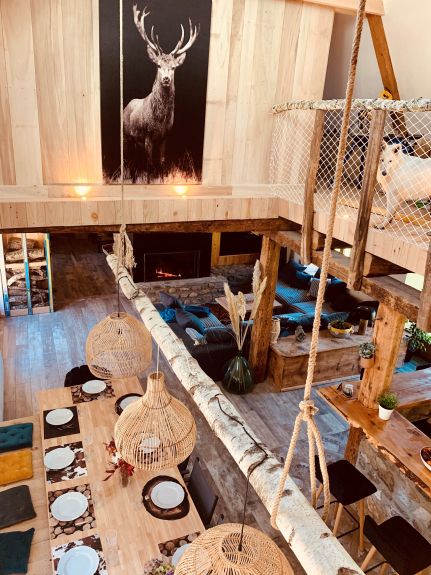 - Lounge met XXL open haard (houtblokken beschikbaar), grote bank en 120cm televisie