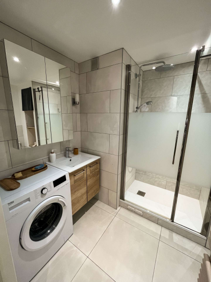 Badkamer: wastafel, douche, wasmachine, WC.