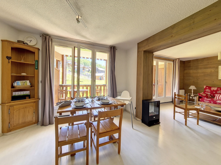 Het is gelegen op de 2e verdieping (geen lift) en heeft een groot balkon op het zuiden met een prachtig uitzicht op het Cochet-massief en de skipistes.