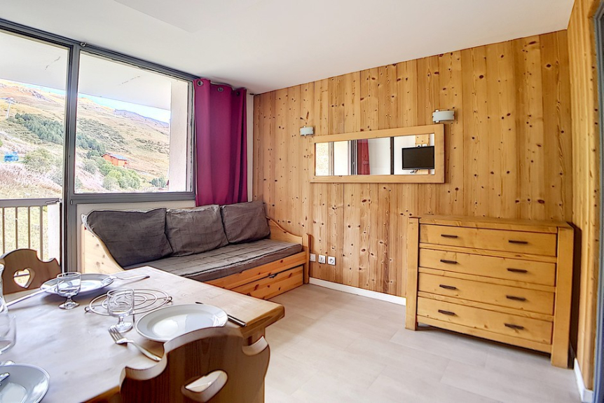 Studio met berghoek van 18m² voor 3 personen. Het is gelegen op de 4e verdieping met lift en heeft een balkon op het oosten.