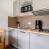 Inbouwkeuken met 2-pits kookplaat, koelkast, magnetron, afwasmachine, broodrooster, waterkoker en koffiezetapparaat.