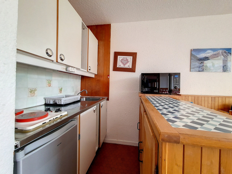 Licht studio-appartement van 19m² met een prachtig uitzicht op de bergketen. Balkon op het westen, ingericht voor 3 personen. Prive ski-locker. 15e verdieping met lift.
