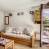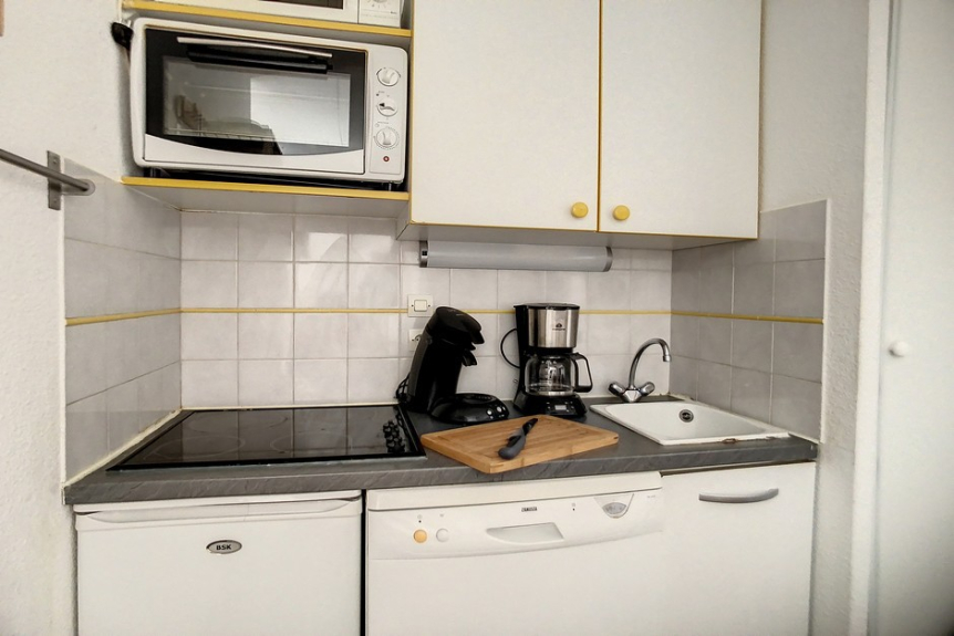 Keuken: koelkast, 2 kookplaten, mini-oven, afwasmachine, waterkoker, broodrooster en koffiezetapparaat.