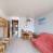 Keuken uitgerust met 2 kookplaten, een koelkast, een mini-oven, een microgolfoven, een vaatwasmachine, een waterkoker, een broodrooster en een koffiezetapparaat.