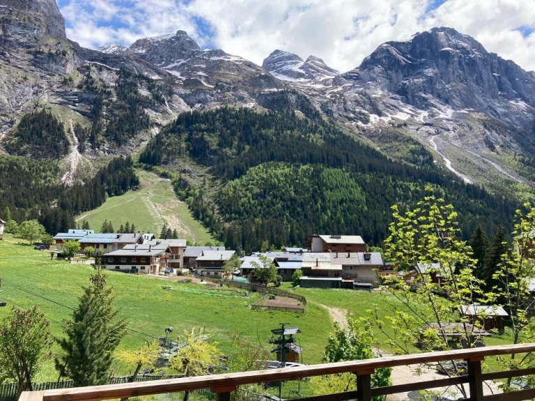 Terug naar de flat met ski's aan! U kunt de pioupious bekijken vanaf het terras.