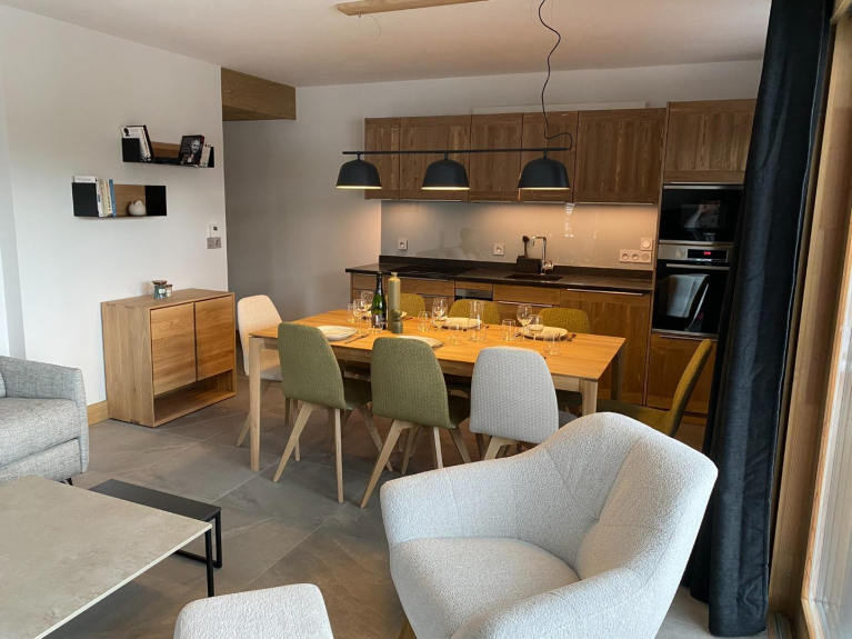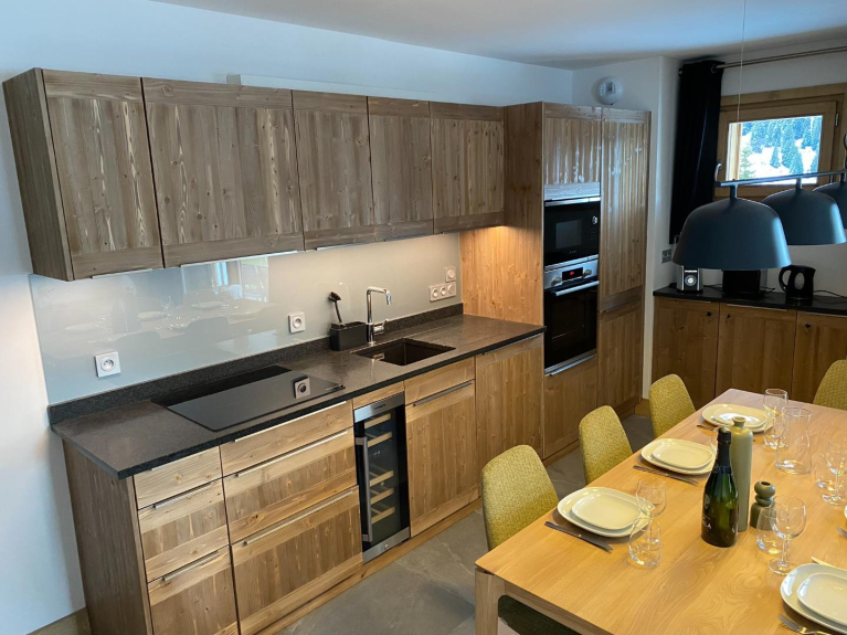 Keuken: volledig uitgerust (inductietafel, magnetron, traditionele oven, wijnkelder, raclette- en fonduestel). Keukenmeubels in lariks en granieten blad.