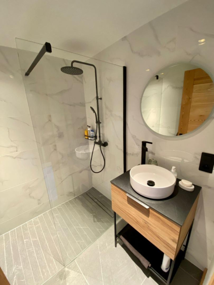 - Elegante badkamer** met Italiaanse douche en grote wastafel.