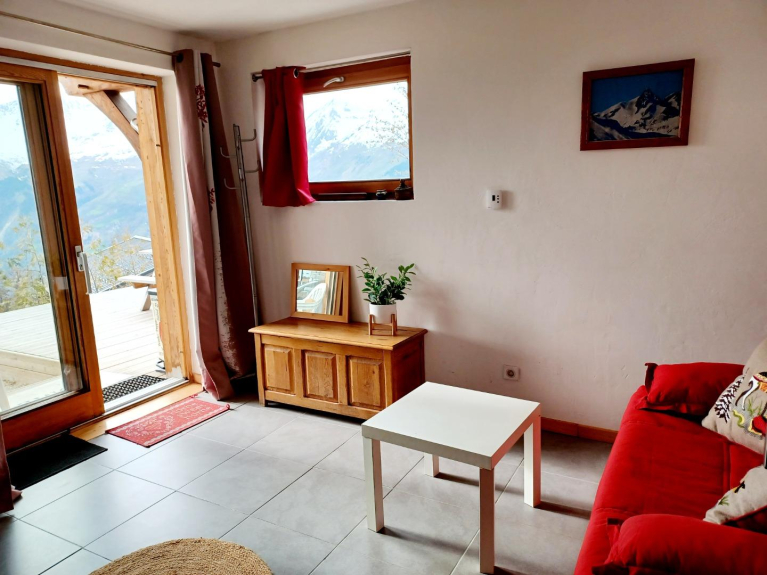 De leefruimte bevindt zich tegenover die van de eigenaars van het chalet voor een behouden intimiteit.