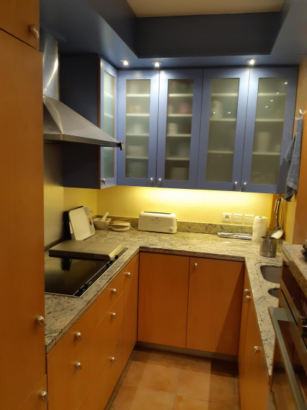 Keuken open naar de woonkamer: keramische kookplaat, vaatwasser, wasmachine, gecombineerde magnetron, koelkast, vriezer en afzuigkap.