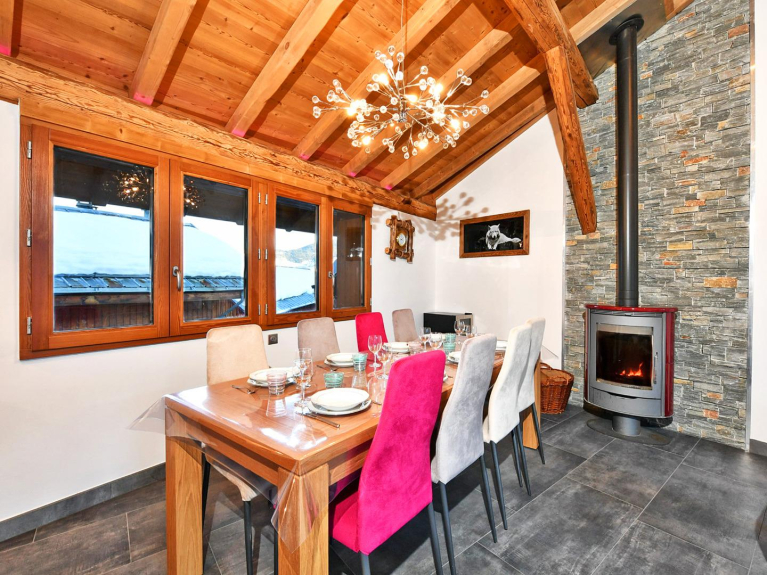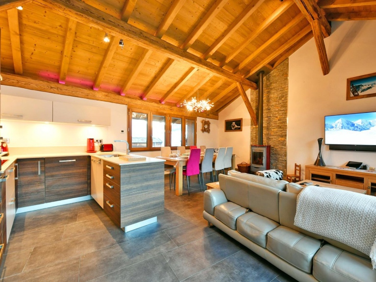 De open woonkamer heeft een volledig uitgeruste keuken, een eethoek met een grote tafel voor 8 personen en een zithoek waar je gezellig kunt zitten bij de houtkachel. Om te ontspannen na een dag op de piste, gaat er niets boven een pauze in de jacuzzi op het terras.