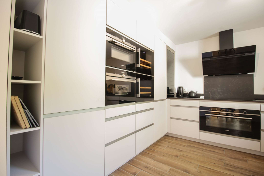 Een grote woonkamer met zithoek, pelletkachel, eethoek en volledig ingerichte keuken: koelkast met vriesvak, vaatwasser, inductiekookplaat, oven en magnetron.