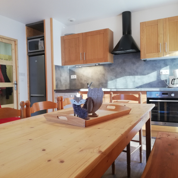 een volledig uitgeruste keuken (vaatwasser, magnetron, koelkast, kookplaat, afzuigkap, koffiezetapparaat, broodrooster, raclette machine op aanvraag).