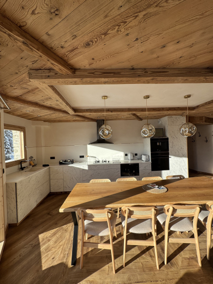 Een traditioneel chalet gebouwd in typische Savoyaardse stijl, met gebruik van warme materialen zoals steen, hout en gaas, en op een ongebruikelijke manier ingericht, zowel binnen als buiten.