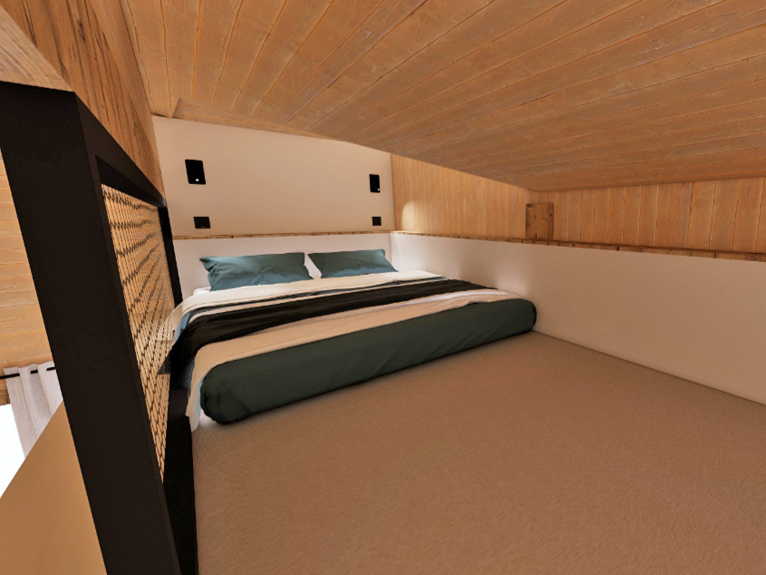 2 slaapkamers (tweepersoonsbed + matras op mezzanine met ladder en onder helling)