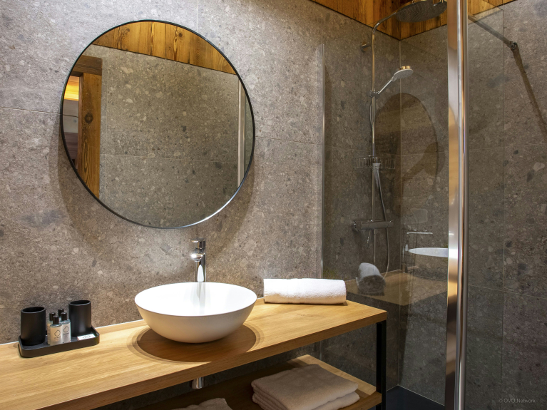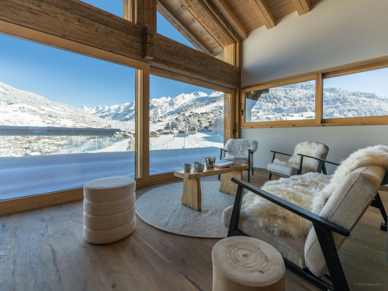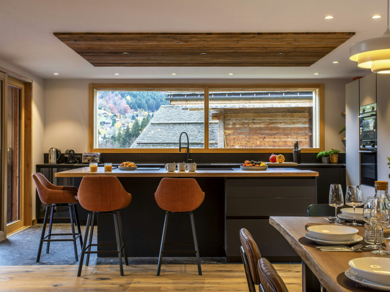 Het woongedeelte is zorgvuldig ontworpen om een adembenemend uitzicht te bieden, of je nu in de woonkamer zit, aan de eettafel of een maaltijd bereidt in de volledig uitgeruste keuken. Bovendien is er een indrukwekkend panoramisch terras waar je samen kunt eten en genieten van de frisse Alpenlucht.