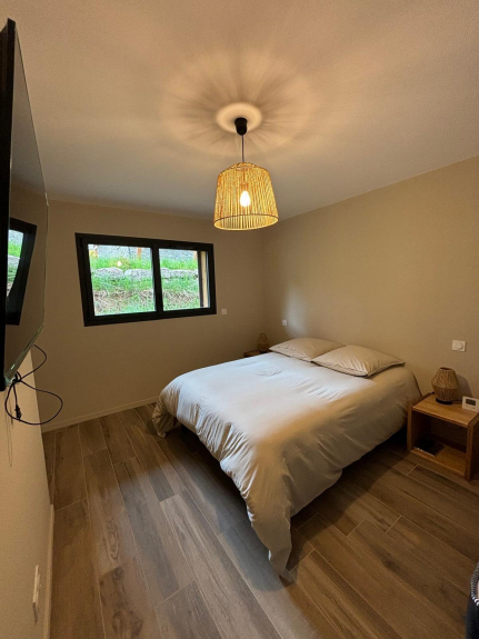 1 ouderslaapkamer met 1 bed van 160 cm, TV en aangrenzende badkamer met douche, dubbele wastafel en WC