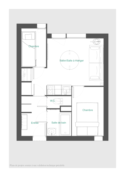 Zeer aantrekkelijk 2-kamerappartement met cabine, 26m², 4 slaapplaatsen, in een residentie aan de voet van de pistes. Het is gelegen op de 2e verdieping, zonder lift, met gratis openbare parkeerplaats in de buurt. Ideaal voor gezinsvakanties.