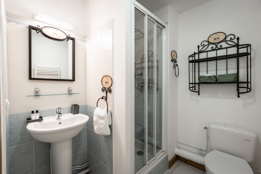 Een slaapkamer met een tweepersoonsbed (160cm), een eigen doucheruimte met toilet en toegang tot het balkon.