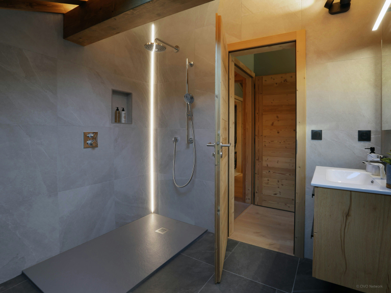 Drie van de vijf slaapkamers van het chalet bevinden zich op tuinniveau en kunnen worden ingericht met een tweepersoonsbed of twee eenpersoonsbedden. Ze komen allemaal uit op een zonnig terras met een jacuzzi. De twee extra slaapkamers op de bovenverdieping hebben elk een eigen doucheruimte en directe toegang tot een balkon.