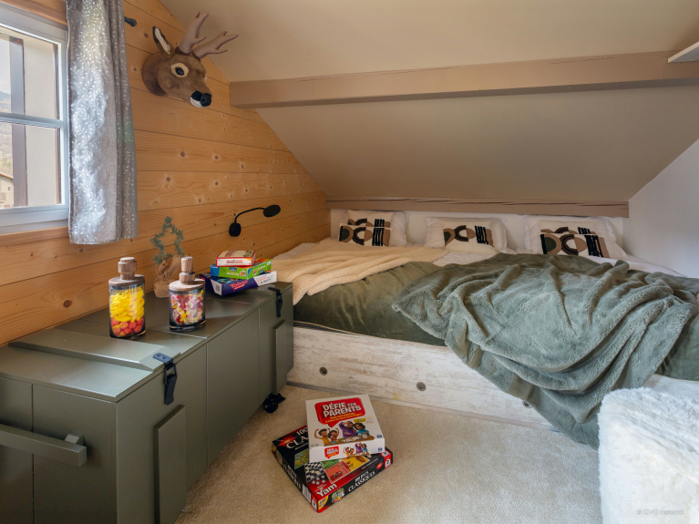 Het chalet wordt omringd door een grote, beveiligde tuin die zich uitstrekt rond het pand en voldoende ruimte biedt voor kinderen om te spelen. Er is ook een tweede terras, met een tafel voor acht personen, perfect om buiten te eten.