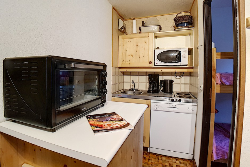 Ingerichte keuken met 2 kookplaten, koelkast, oven, magnetron, vaatwasser, elektrisch koffiezetapparaat, waterkoker en SENSEO koffiezetapparaat.