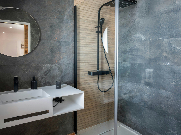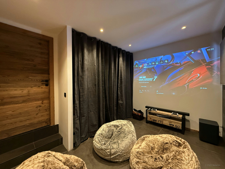Op de begane grond zijn er twee tweepersoonskamers en een slaapzaal met twee stapelbedden. Elk van deze kamers heeft een elegante eigen badkamer met douche, en twee van hen komen uit op een terras, waar je de jacuzzi en ligstoelen vindt. Kinderen zullen genieten van hun eigen speelkamer, uitgerust met een videoprojector, waar ze computerspelletjes of karaoke kunnen spelen. Deze verdieping heeft ook een wasruimte en een skiruimte met verwarmde droger voor schoenen.