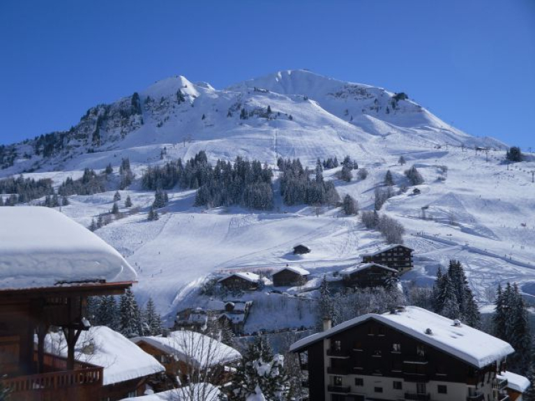 Studio vlakbij de pistes - Balkon op het zuiden - Ononderbroken uitzicht - Alle winkels in het skioord - Pendelbus op 50 meter - Langlaufen op 150 m - Ski afdaling op 500 m - Hoogte 1300 meter, top van de pistes 2100 meter - Bereikbaarheid via A40 - Reservering na 19 uur.