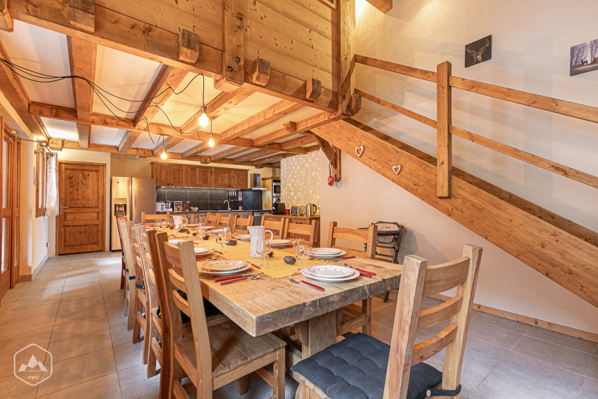 - Grote volledig ingerichte keuken (oven ? magnetron ? vaatwasser ? Amerikaanse koelkast - koffiezetapparaat ? waterkoker ? broodrooster ? fonduestel ? raclette machine) uitgevend op de eetkamer met een grote tafel voor 14 personen (kinderstoel).