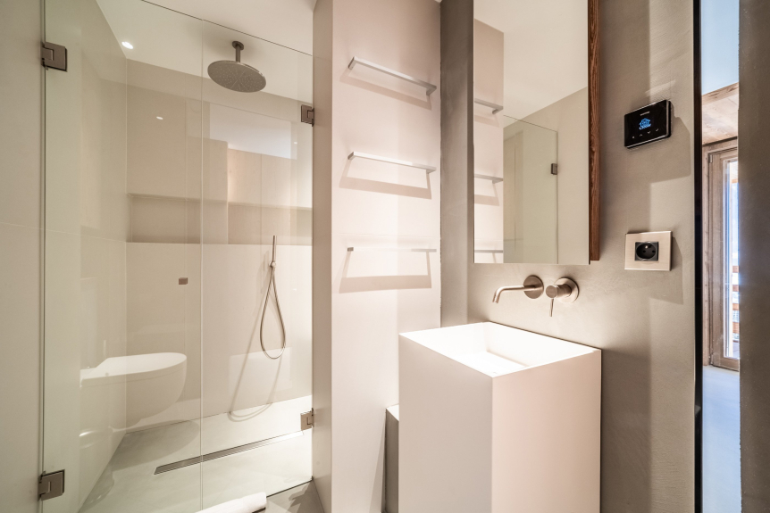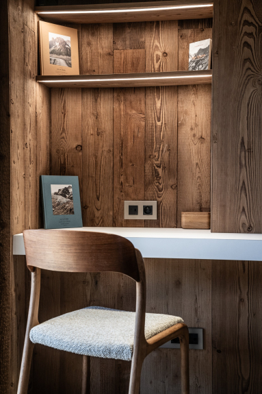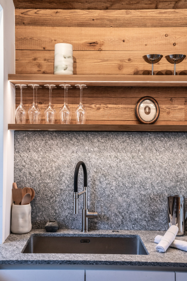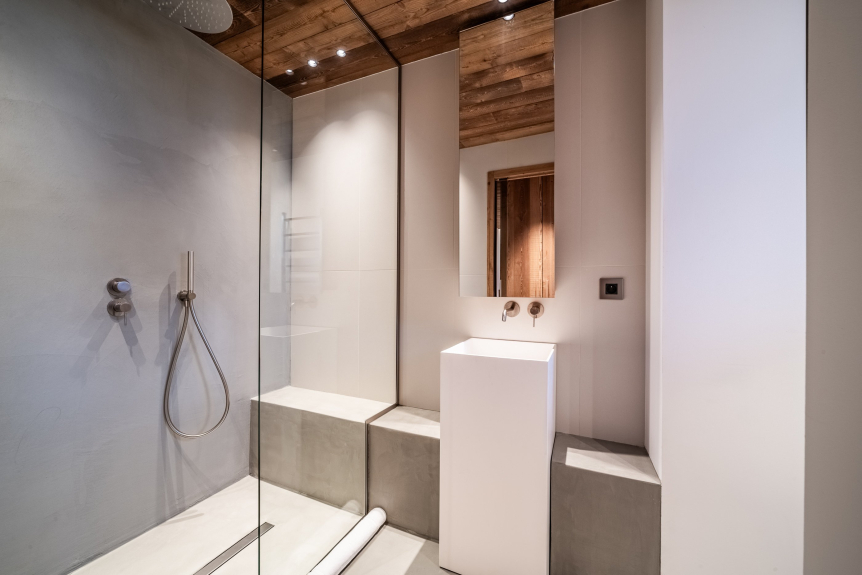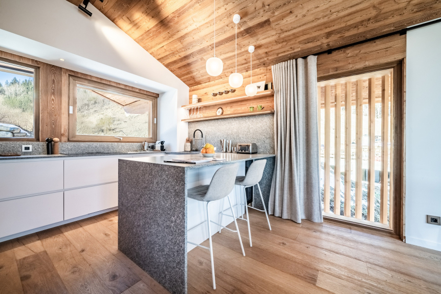De grote, open woonkamer baadt in het licht dankzij de grote ramen die het uitzicht op de bergtoppen omlijsten. Alles nodigt uit om te delen, van het knapperende vuur in de open haard tot het ruime terras waar je kunt genieten van een kopje koffie bij zonsopgang of een drankje in de schemering, met uitzicht op de bergtoppen. Na een dag op de piste is het tijd om te ontspannen, opgerold op een zachte bank of genietend van een welverdiende saunasessie.