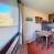 Open keuken uitgerust met 2 keramische kookplaten, koelkast, mini-oven, magnetron, waterkoker, broodrooster en koffiezetapparaat.