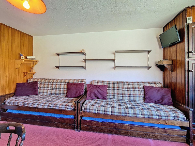 Woonkamer: 1 slaapbank + 1 slaapbank en een uitschuifbaar bed. Uitgerust met een televisie.