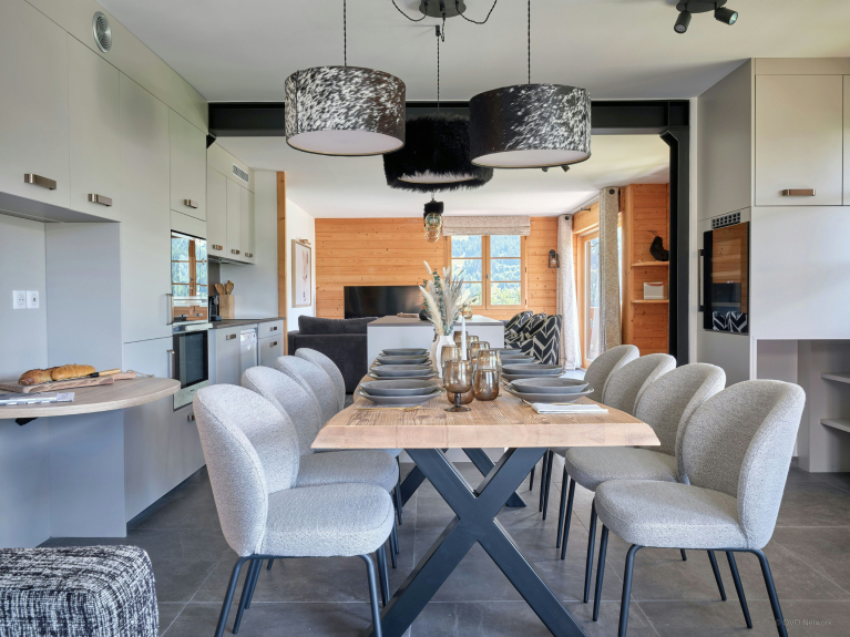 De ene heeft een open haard, de andere een televisie. Elke loungeruimte komt uit op een balkon op het zuiden, de ene met een jacuzzi, de andere met een tweede eettafel. Zo kun je genieten van het uitzicht en de Alpenlucht terwijl je dineert.